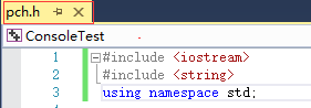 比如上面的代码,我们将其中的引用头文件和使用命名空间的代码提取出来,写进pch.h头文件;然后,我们得到代码如下图: