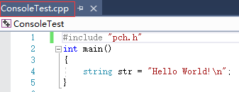 然后我打开ConsoleTest.cpp 文件,定义一个字符串hello world,准备在控制台输出一下,结果发现编译器报错。。。只好调查一下了。