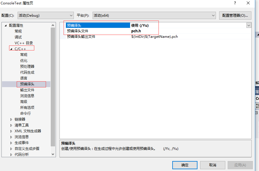 如图,系统我们创建的pch.h头文件,被设置成了预编辑头文件。