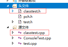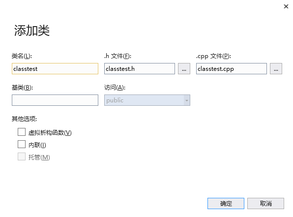 右键头文件文件夹—>添加——>类,在类名处输入classtest,如下图。