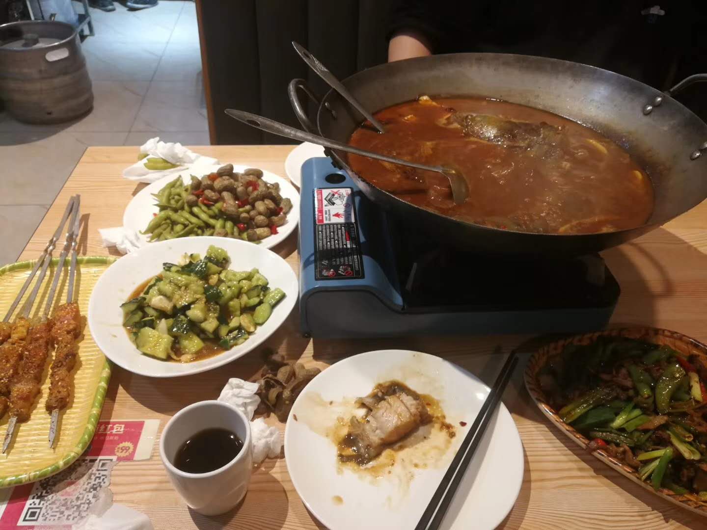 定期吃饭的传统还是一直延续着的,每个周末都会一起楼下家常菜或者是烤串,离开北京的前几天,我的室友白羽鸡还请我吃了一顿铁锅炖鱼,哈哈哈。