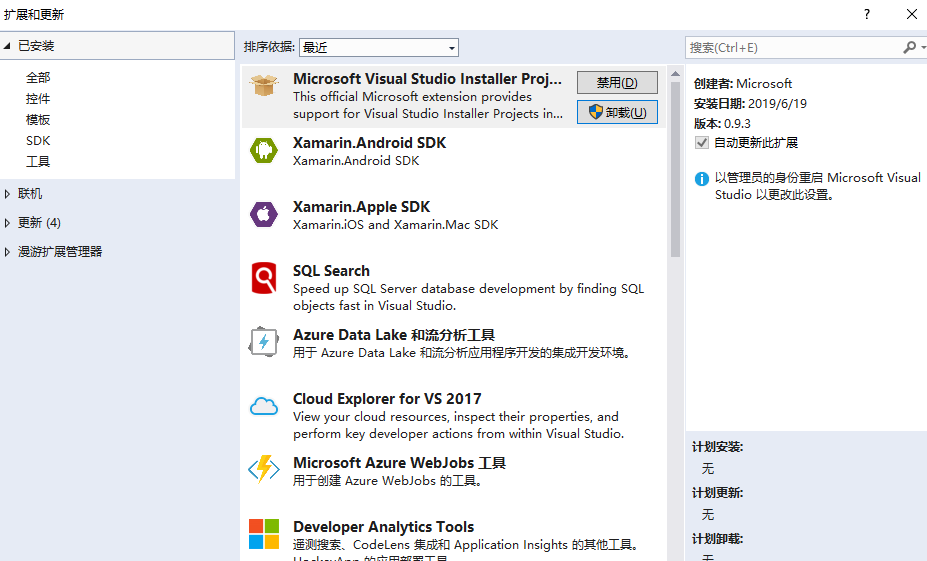界面默认显示的是已安装的内容,我们仔细看下内容,会发现,这里都是我们已经安装过的工具;在仔细看,我们会发现,这里大部分工具的创建者都是microsoft;也就是说,这里的工具都是官方给我们提供的工具。