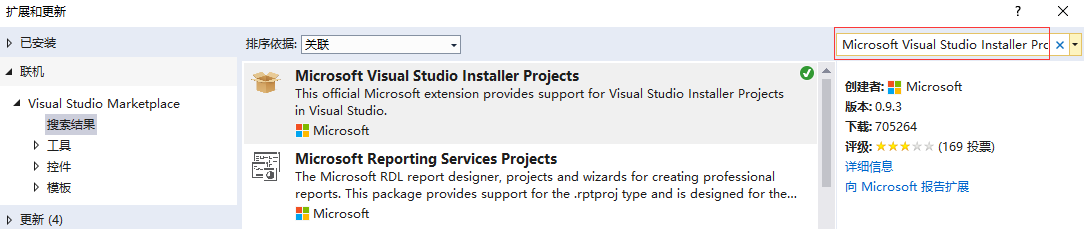 因为我们要下载本机不存在的工具,所以我们点击左侧菜单的【联机】按钮,然后在右上角的搜索框中输入Microsoft Visual Studio Installer Projects进行检索,如图: