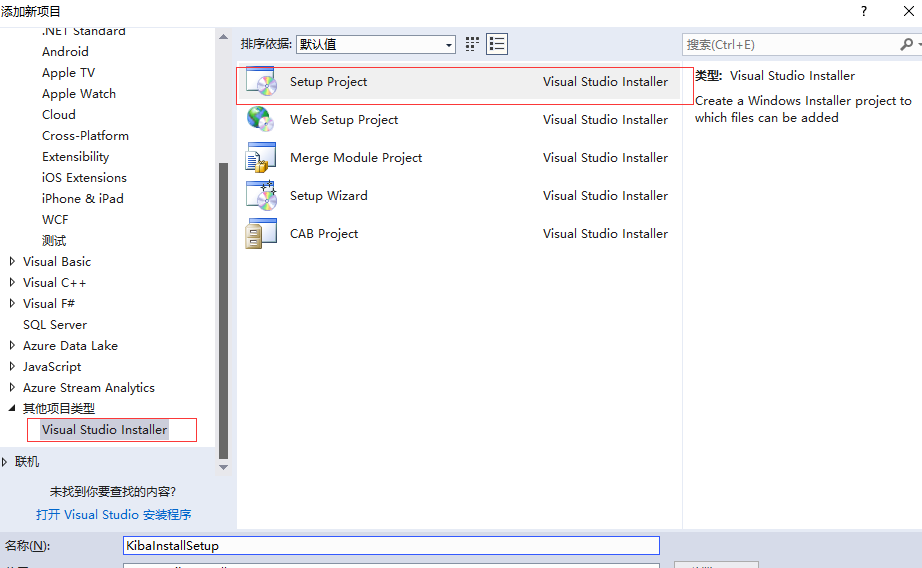 在WPF项目所在的解决方案中,我们右键新建项目,然后选择左边菜单的【其他项目类型】—【Setup Project】,创建安装工程KibaInstallSetup,如下图: