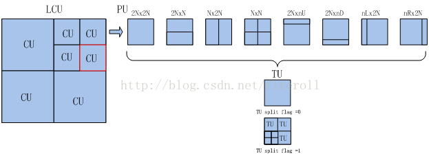 1.编码块划分结构:采用CU (CodingUnit)、PU(PredictionUnit)和TU(TransformUnit)的递归结构。