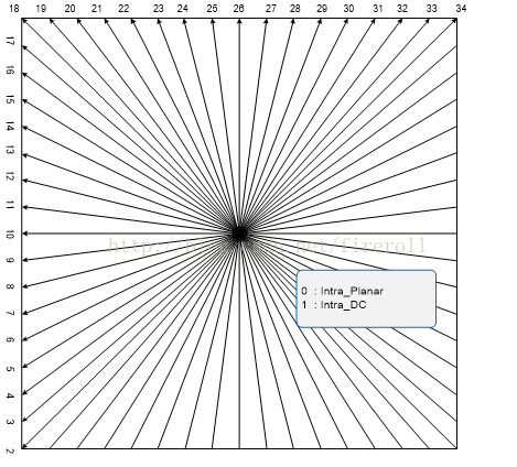 HEVC定义了33种预测角度的集合,其精度为1/32。根据经验,图像内容中水平和垂直一致通常出现的概率超过其他方向一致。相邻方向之间的角度差越接近这两个方向便越小,越靠近对角线方向便越大,其目的在于在接近水平和垂直模式时可以提供更加精准的预测结果,而在出现机会较低的对角方向减小预测的运算负荷。