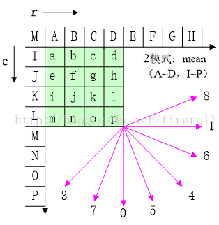 DC模式,所有预测像素值都是同一个值,也即参考数据的均值,这也是DC模式命名的由来。