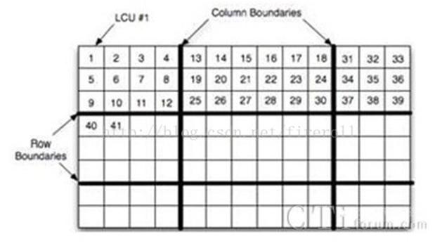 如图3所示,用垂直和水平的边界将图像划分为一些行和列,划分出的矩形区域为一个Tile,每一个Tile包含整数个LCU(Largest Coding Unit),Tile之间可以互相独立,以此实现并行处理: