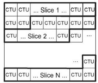 Slice是一帧中按光栅扫描顺序排列的CTU序列,一帧可以由多个slice组成,每个Slice可以独立解码,因为slice内像素的预测不能跨越slice的边界。每个slice可按照编码类型的不同分成I/P/B slice。该结构的主要目的是实现在传输中遭遇数据丢失后的重新同步。每个slice可携带的最大比特数通常受限,因此根据视频场景的运动程度,slice所包含的CTU数量可能有很大不同。