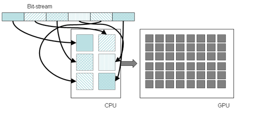 在提案中sharp还提出了一个CPU+GPU混合编码的方案,熵编码由多核CPU进行而重建则由GPU进行,可以大幅提高编码速度,如下图所示。