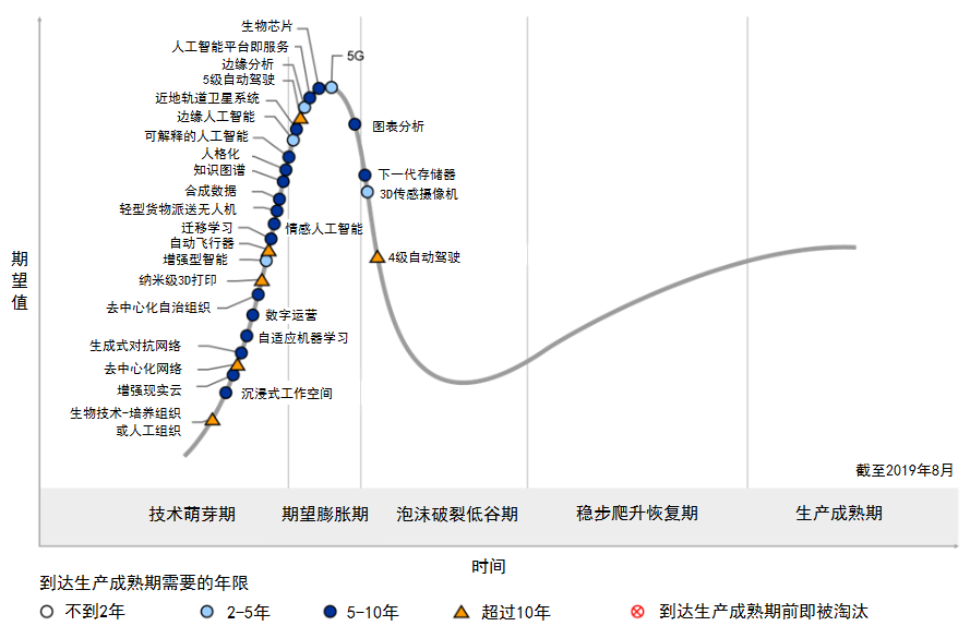 再看技术层面。Gartner发布的2019年8月的技术成熟度曲线中,大量为我们熟知的新技术都处于泡沫和悲观阶段,大家所盼望的新动力源迟迟还未出现。