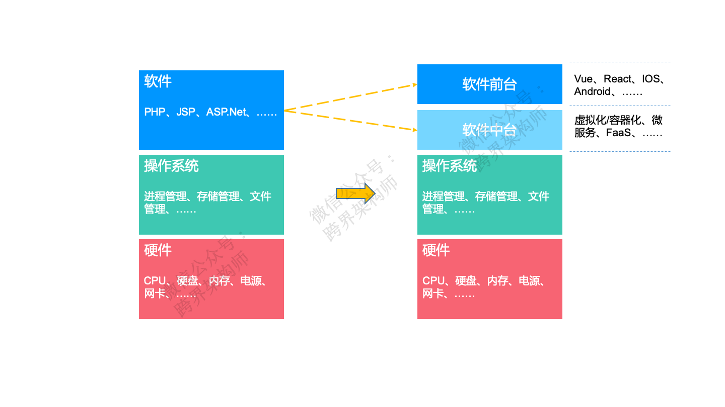 所以,原来的软件 -> 操作系统 -> 硬件的关系,就变成了。软件前台 -> 软件中台 -> 操作系统 -> 硬件。