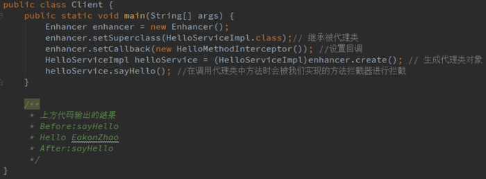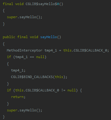 - 代理类会为委托方法生成两个方法,一个是重写的sayHello方法,另一个是CGLIB$sayHello$0方法,我们可以看到它是直接调用父类的sayHello方法;