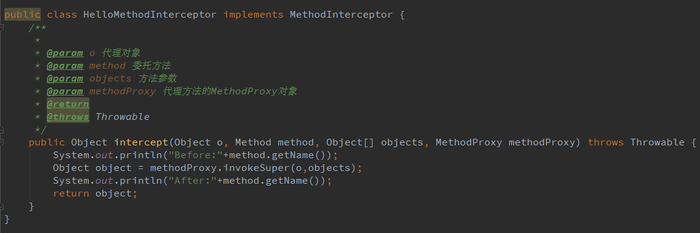 在intercept方法中,我们除了会调用委托方法,还会进行一些增强操作。在Spring AOP中,典型的应用场景就是在某些敏感方法执行前后进行操作日志记录。