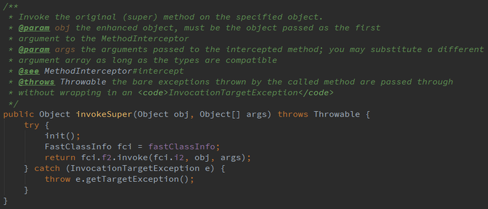 我们从图2.1中看到,调用委托方法是通过代理方法的MethodProxy对象调用invokeSuper方法来执行的,下面我们看看invokeSuper方法中的玄机: