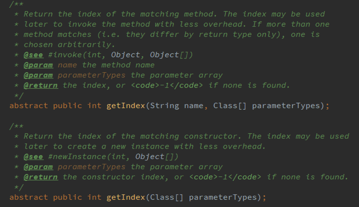 我们知道,在JDK动态代理中方法的调用是通过反射来完成的。如果有对此不太了解的同学,可以看下我之前的博客----深入理解JDK动态代理机制。但是在CGLIB中,方法的调用并不是通过反射来完成的,而是直接对方法进行调用:FastClass对Class对象进行特别的处理,比如将会用数组保存method的引用,每次调用方法的时候都是通过一个index下标来保持对方法的引用。比如下面的getIndex方法就是通过方法签名来获得方法在存储了Class信息的数组中的下标。