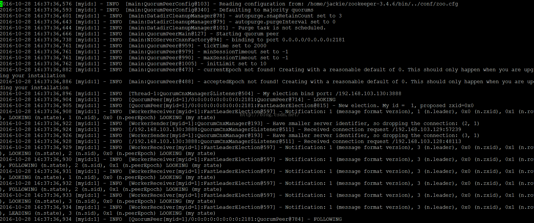 Zookeeper具体的启动日志如下图所示: