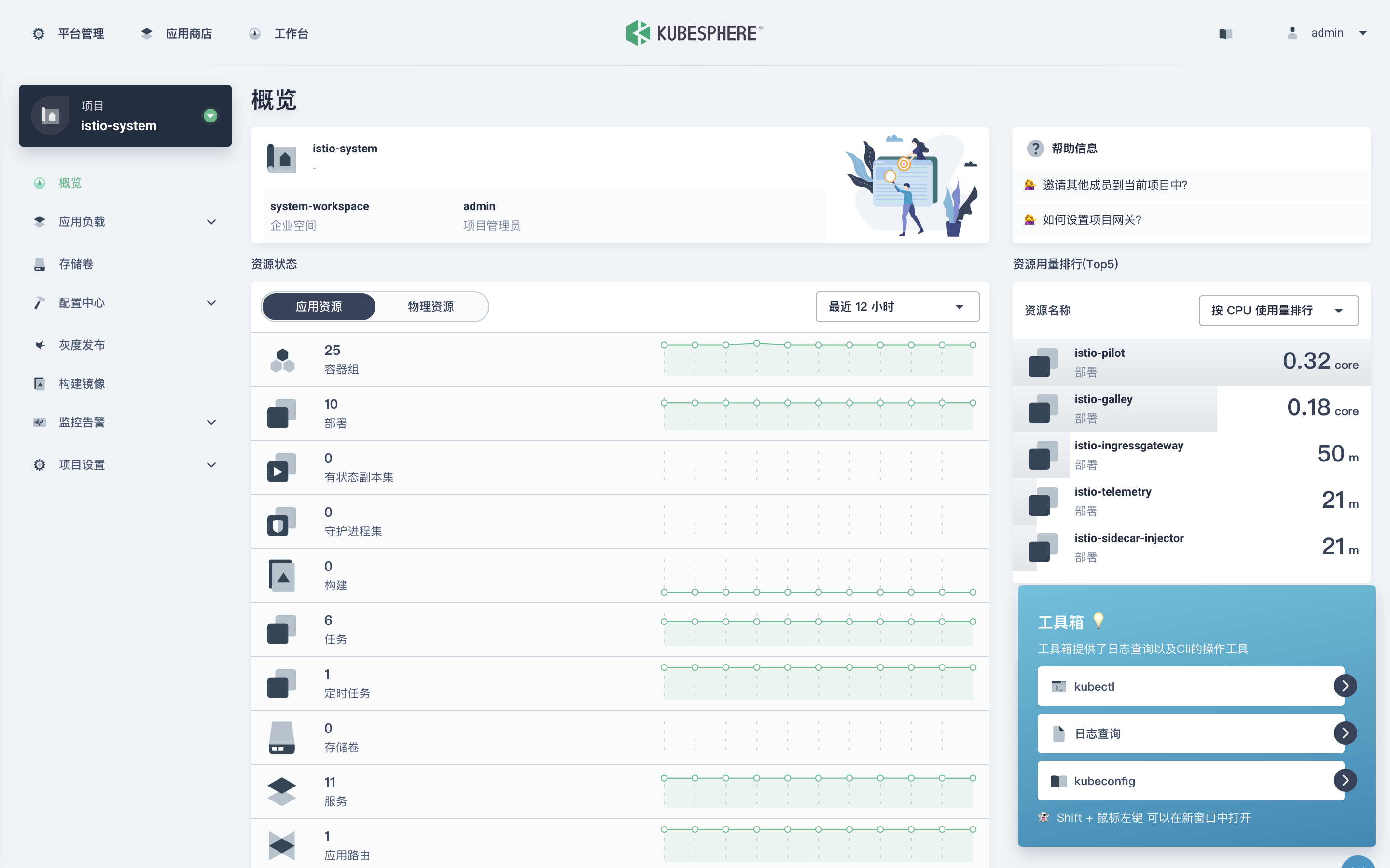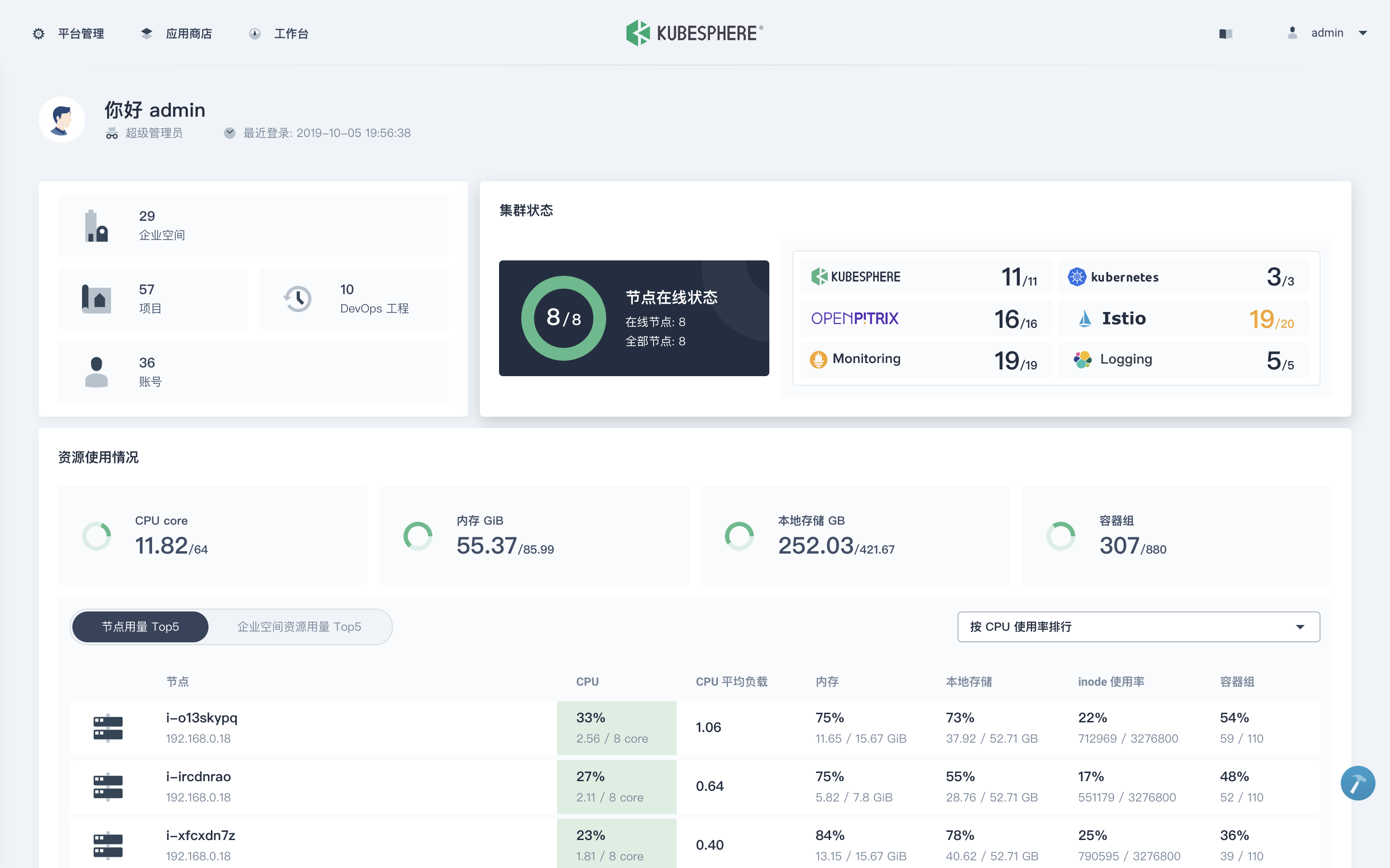 KubeSphere (kubesphere.io) 是在 Kubernetes 之上构建的以应用为中心的容器平台,支持部署和运行在任何基础设施之上,提供简单易用的操作界面以及向导式操作方式,在降低用户使用容器调度平台学习成本的同时,极大减轻开发、测试、运维的日常工作的复杂度,旨在解决 Kubernetes 本身存在的存储、网络、安全和易用性等痛点。帮助企业轻松应对敏捷开发、自动化运维、应用快速交付、微服务治理、多租户管理、监控日志告警、服务与网络管理业务场景。