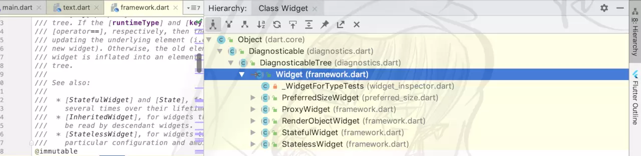 下图可见Widget类在Flutter的框架层中是比较顶尖的类。