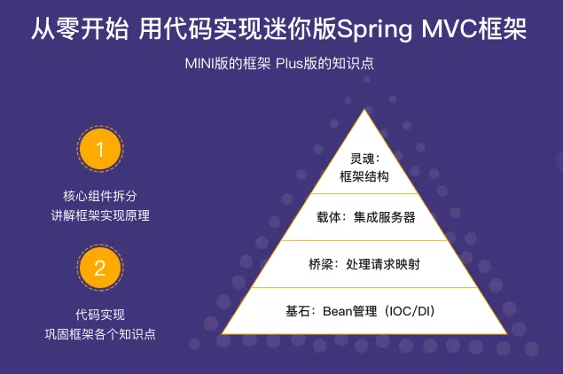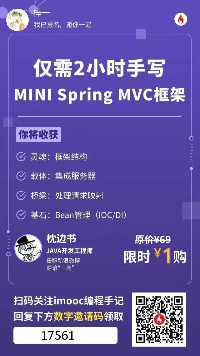 慕课网推出了微课《仅需2小时 手写MINI Spring MVC框架》,本次课程通过开发一个Spring MVC框架,逐个完成框架模块的编写,进而带你理解Spring MVC框架的实现原理,提升开发水平。