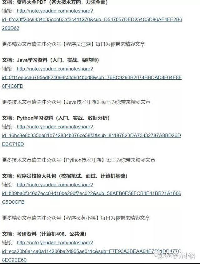 以下资料都将会整理到《程序员黄小斜2019学习资料》中,只需关注微信公众号【程序员黄小斜】后回复【2019】即可领取所有资料,没有其他套路,应该算是比较良心了。