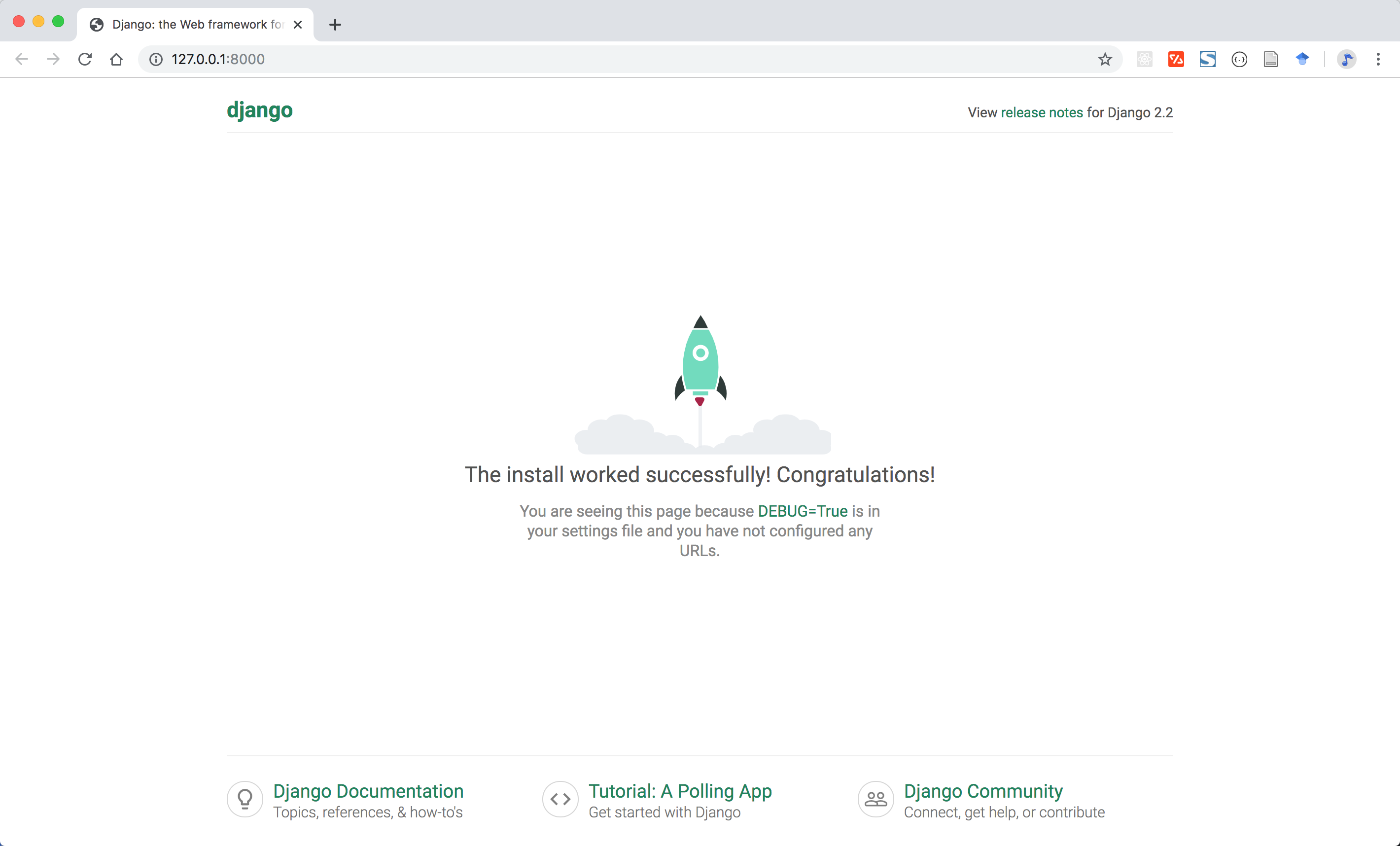 按照提示,我们通过浏览器访问 localhost:8000,可以看到欢迎界面:
