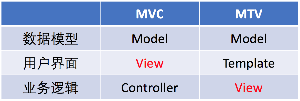 实际上,每个 Django App 的组织结构符合 Django 的 MTV 法则——Model(模型)+ Template(模板)+ View(视图)。MTV 与大家比较熟悉的 MVC 在思想上非常相似,但是命名有比较大的出入,如下表所示: