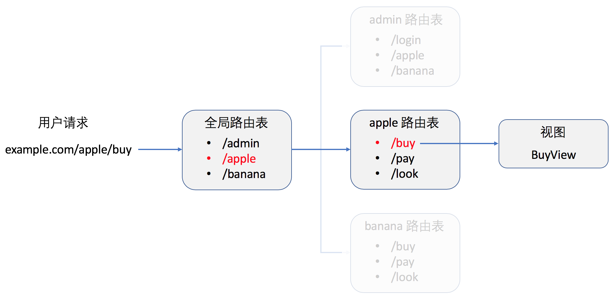 例如,用户访问 example.com/apple/buy,然后全局路由根据 /apple/buy 先选择 apple 的路由表,再从 apple 路由表中根据 /buy 选择 /buy 路由,然后执行 /buy 对应的 BuyView 视图,返回给用户结果。