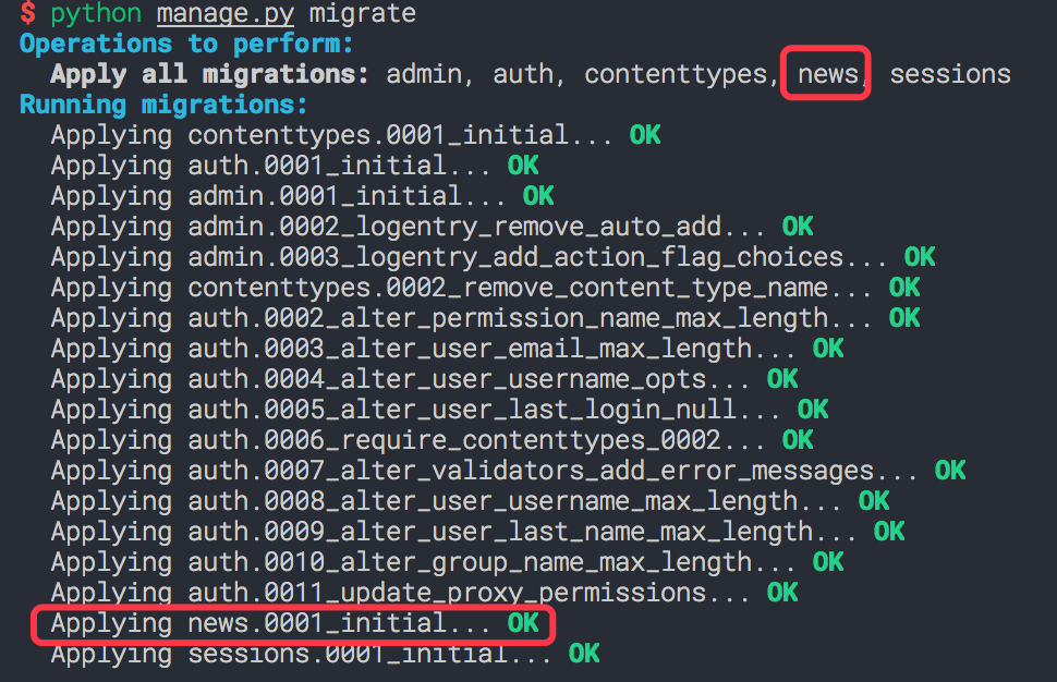 并且成功地自动创建了 news/migrations/0001_initial.py 迁移脚本。接着我们进行数据库迁移: