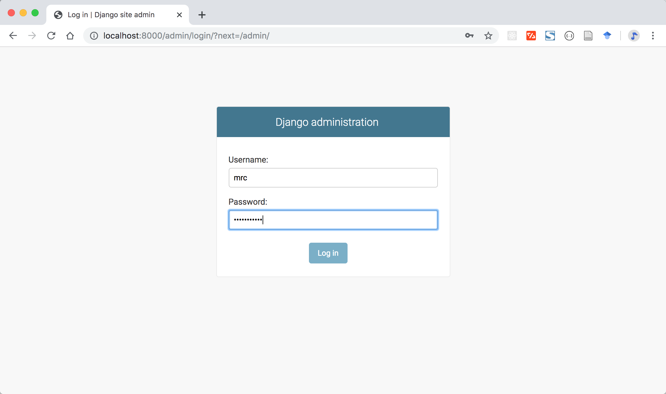 按照提示填写用户名和密码即可。然后访问 localhost:8000/admin,进入后台系统的登录页面: