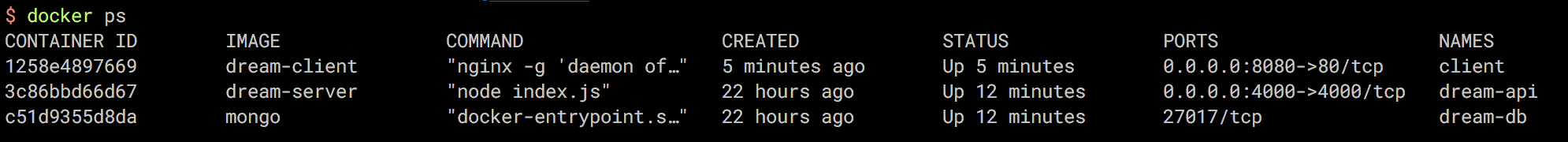 docker run --name dream-db --network dream-net -d mongo