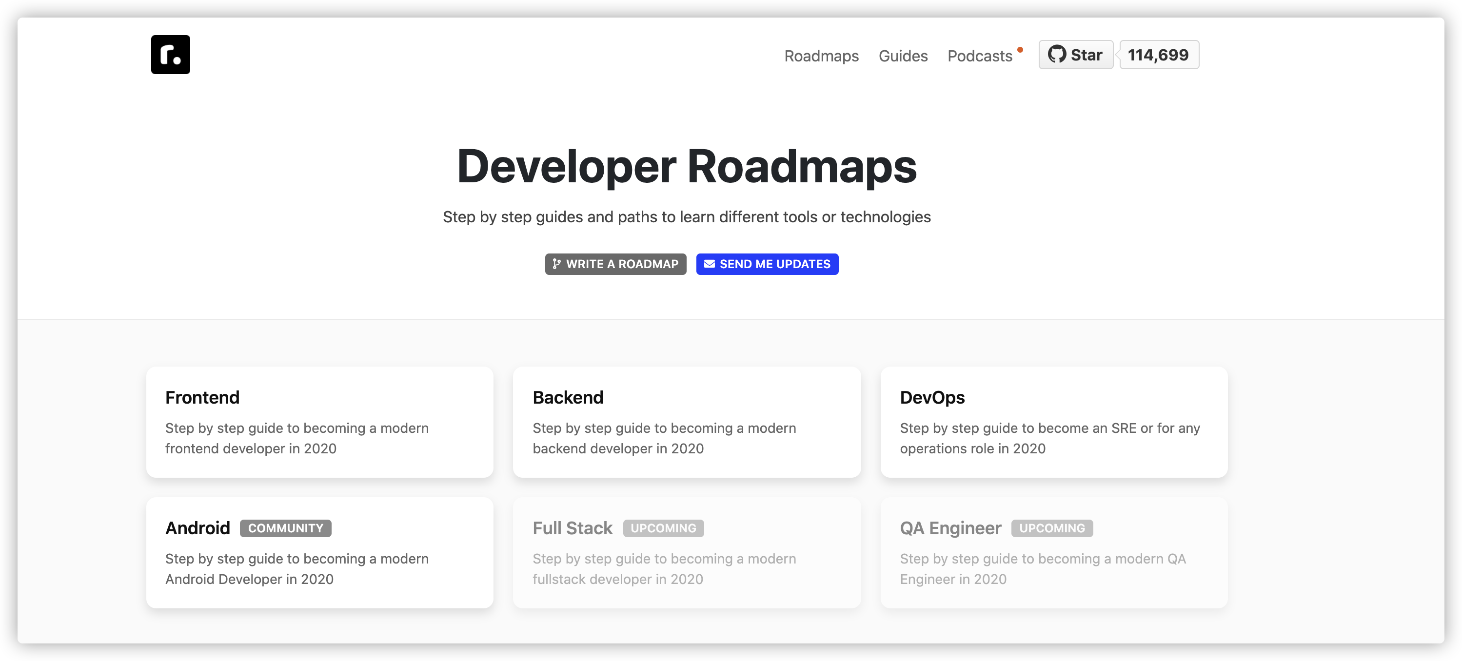 Github 地址 :https://github.com/kamranahmedse/developer-roadmap ,中文翻译版本在此:https://github.com/kamranahmedse/developer-roadmap/tree/master/translations/chinese 。