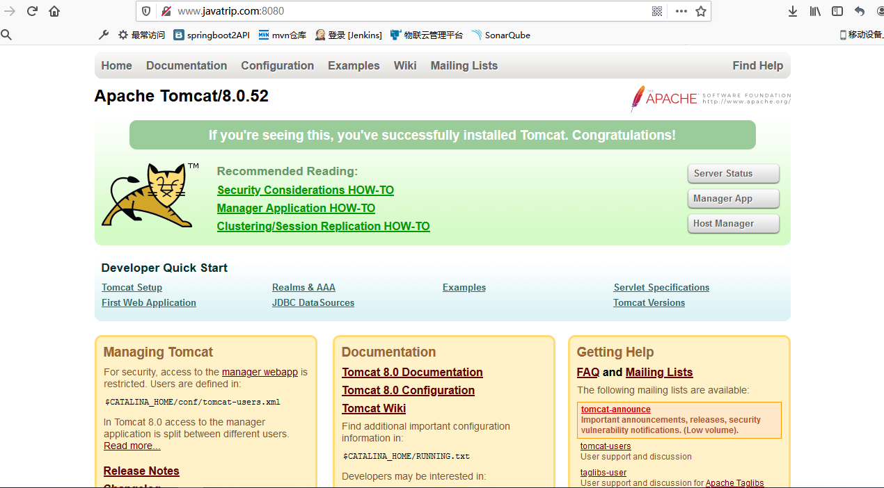 现在浏览器访问www.javatrip.com,发现直接转发到了tomcat上了,这样简单的反向代理就完成了。