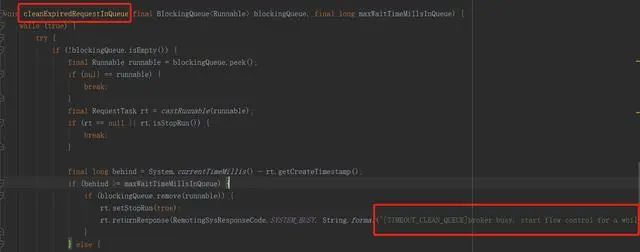 首先我们根据关键字:TIMEOUT_CLEAN_QUEUE 去 RocketMQ 中查询,去探究在什么时候会抛出如上错误。根据全文搜索如下图所示: