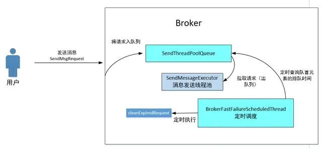 故 RocketMQ 为了解决该问题,引入 Broker 端快速失败机制,即开启一个定时调度线程,每隔10毫秒去检查队列中的第一个排队节点,如果该节点的排队时间已经超过了 200 ms,就会取消该队列中所有已超过200ms的请求,立即向客户端返回失败,这样客户端能尽快进行重试,因为 Broker 都是集群部署,下次重试可以发送到其他 Broker 上,这样能最大程度保证消息发送在默认3s的时间内经过重试机制,能有效避免某一台 Broker 由于瞬时压力大而造成的消息发送不可用,从而实现消息发送的高可用。
