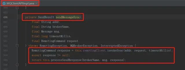 MQ Client 消息发送端首先会利用网络通道将请求发送到 Broker,然后接收到请求结果后并调用 processSendResponse 方法对响应结果进行解析,如下图所示: