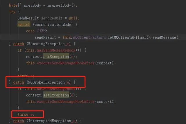 这里非常令人意外的是连 SYSTEM_ERROR 都会重试,却没有包含 SYSTEM_BUSY,显然违背了快速失败的设计初衷,故笔者断定,这是 RocketMQ 的一个BUG,将 SYSTEM_BUSY 遗漏了,后面与 RocketMQ 核心成员进行过沟通,也印证了这点,后续会提一个PR,在上面增加一行代码,将 SYSTEM_BUSY 加上即可。
