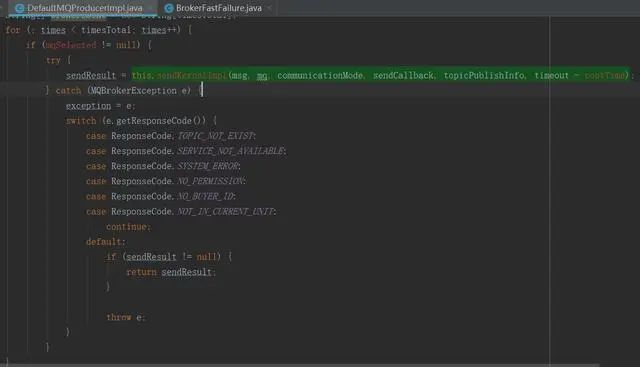 那我们沿着该方法的调用链,可以找到其直接调用方为:DefaultMQProducerImpl 的 sendKernelImpl,我们重点考虑如果底层方法抛出 MQBrokerException 该方法会如何处理。