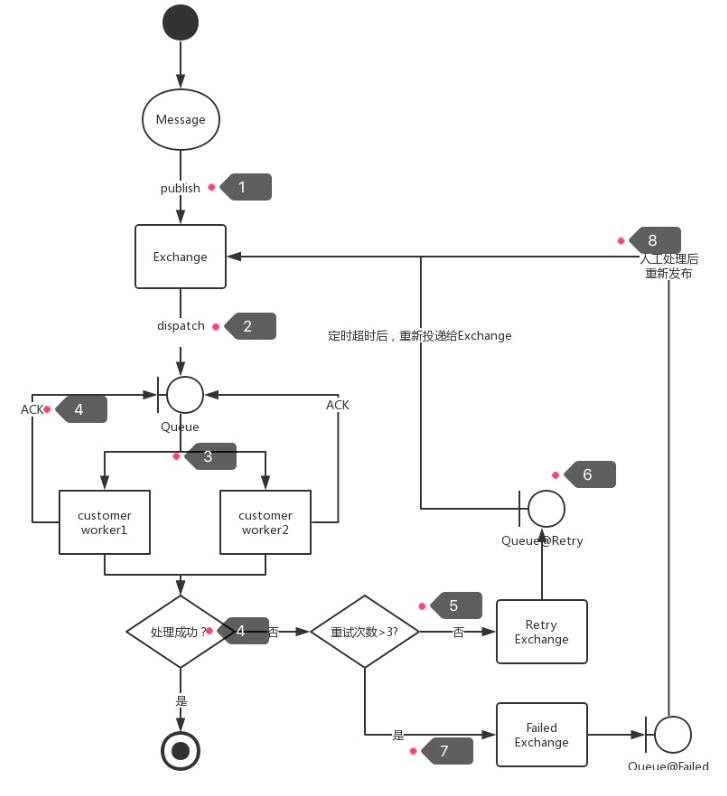 如果消费者处理消息失败后不重试,然后发送应答给rabbitmq,rabbitmq就会将队列中的消息删除,从而造成消息的丢失。所以我们要在消费者处理消息失败的时候,重试一定的次数。比如重试3次,如果重试3次之后还是失败,则把这条消息发送到死信队列。