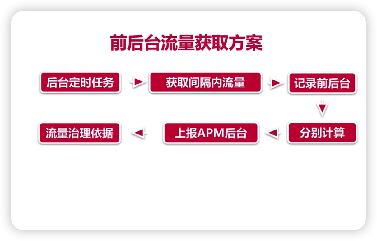 - 流量消耗,一段时间流量消耗的精准度量,包括网络的类型,前后台流量的消耗。还要完善相关的监控,如用户流量消耗均值、异常率等。还要完善完成链路的监控,包括 Request 和 Response,实现主动上报。