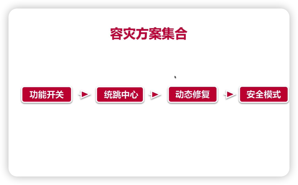- 兜底策略,在发现了异常之后,我们可以通过一些兜底策略来解决问题,比如支持通过配置中心配置功能开关是否打开,当发现某个新功能有问题时,我们可以直接隐藏该功能,或者通过配置路由的方式跳转到另一个方式。