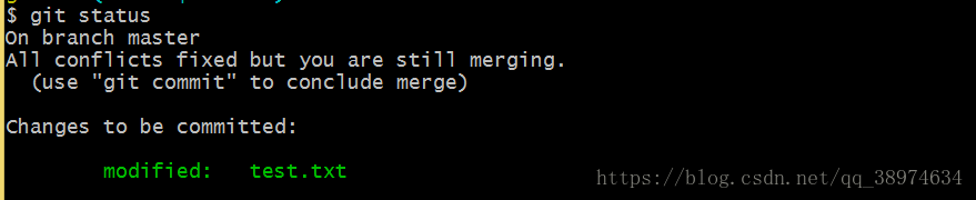 第二步:执行 merge 命令 git merge [有新内容分支名]