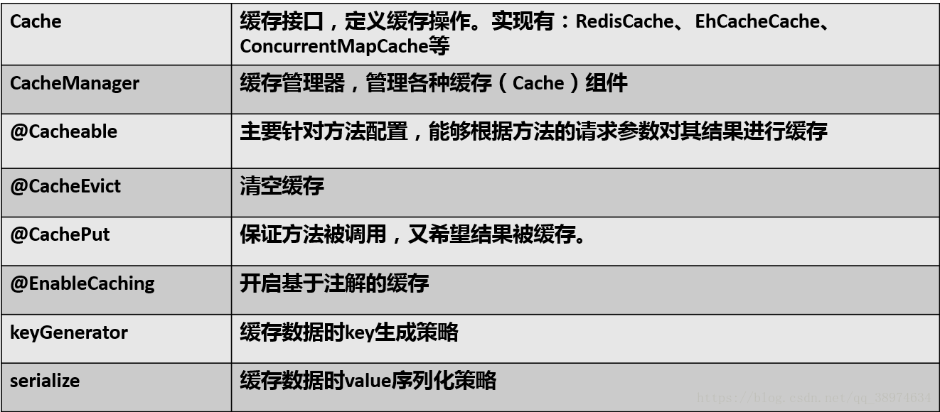 2 Cache接口下Spring提供了各种xxxCache的实现,如RedisCache,EhCacheCache , ConcurrentMapCache等;每次调用需要缓存功能的方法时,Spring会检查检查指定参数的指定的目标方法是否已经被调用过;如果有就直接从缓存中获取方法调用后的结果,如果没有就调用方法并缓存结果返回给用户。下次直接从缓存中获取。