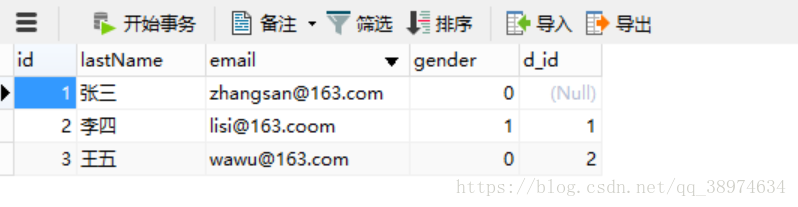DROP TABLE IF EXISTS `employee`; CREATE TABLE `employee` ( `id` int(11) NOT NULL AUTO_INCREMENT, `lastName` varchar(255) DEFAULT NULL, `email` varchar(255) DEFAULT NULL, `gender` int(2) DEFAULT NULL, `d_id` int(11) DEFAULT NULL, PRIMARY KEY (`id`) ) ENGINE=InnoDB DEFAULT CHARSET=utf8;