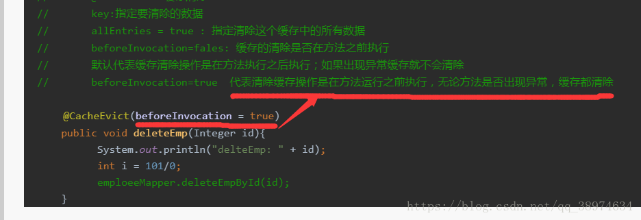// beforeInvocation=true 代表清除缓存操作是在方法运行之前执行,无论方法是否出现异常,缓存都清除