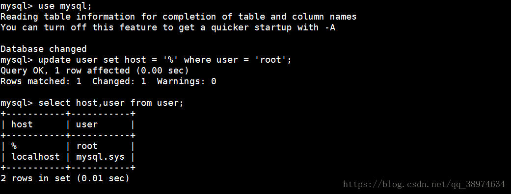 3.更改user表中的root对应的host,改成%号之后(把localhost变成%),就可以进行远程登陆了。