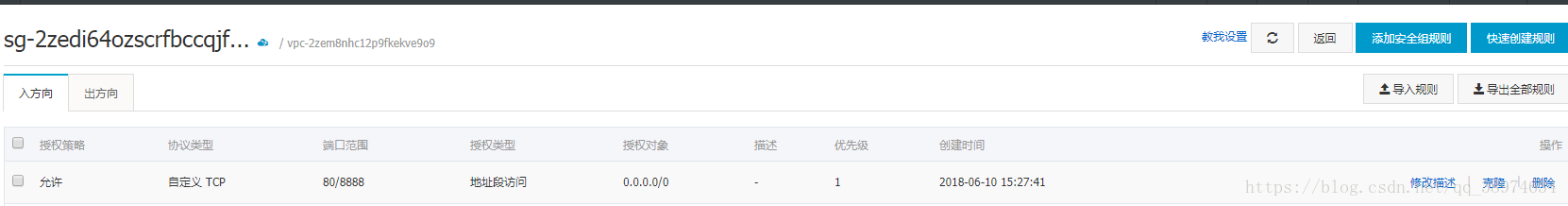 7.当然如果使用的是阿里云的服务器的话,还要添加安全组规则 ,0.0.0.0/0代表所有ip都可以访问