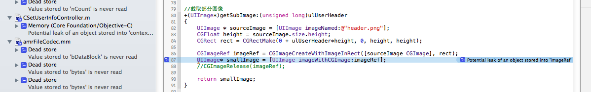Analyze已经分析出imageRef对象有内存泄漏,这种情况在编译时是无法发现的。