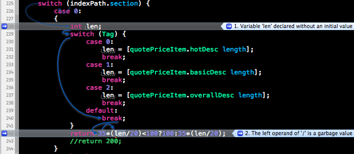 Analyze还给出了箭头提示:len is a garbage value。建议在声明变量时,同时进行初始化。