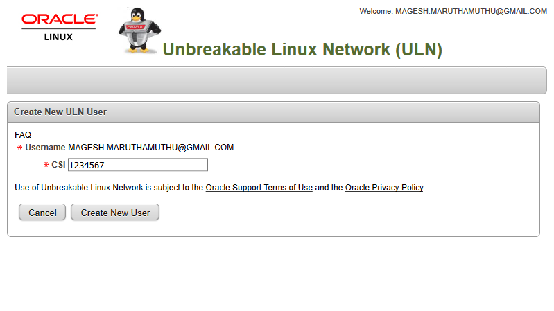 要注册为一个 ULN 用户,需要你有一个 Oracle Linux 支持或者 Oracle VM 支持的有效客户支持代码(CSI)。